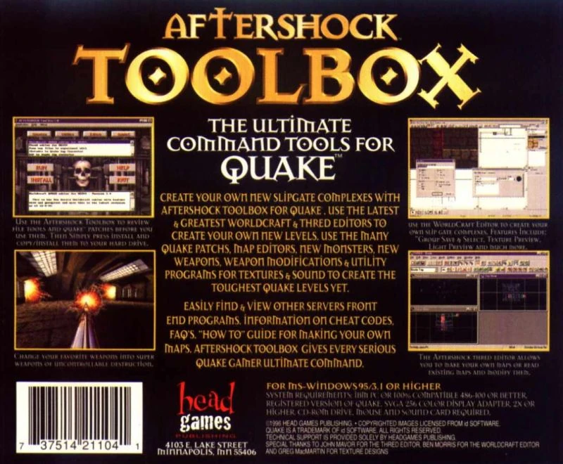 HeadGames Publishing, Inc.'s previous release, Aftershock for Quake, focused primarily on custom levels with some additional features included such as THRED. This release focuses on collecting the various level editors, tools for modifying Quake files, and mods to the game files to include new Monsters and Weapons. It also includes a patch for the Windows 95 launcher of Aftershock for Quake.