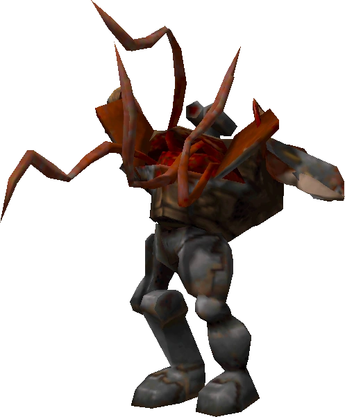 In Quake II, Brains is a strange Strogg creature, constructed from a grim mixture of human and mechanical body parts. It has a small stereo-camera in place of a head, two arm hooks, multiple hooked tentacles within its opening chest cavity, and mismatched legs which cause it to lumber forward slowly and awkwardly. Brains has good durability and is equipped with a Power Screen for additional protection. It is an uncommon enemy, only being encountered in a few levels of the original Quake II campaign, first appearing in the Receiving Center in Unit 5.