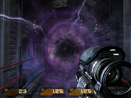In Quake 4, the Dark Matter Gun is a very powerful Weapon that fires balls of Dark Matter that can kill most enemies in one hit and most stronger enemies in 2 hits. It can also deal large amounts of damage against bosses. When fired, the dark matter core slowly travels through the air, until it hits a wall. Most enemies will be sucked into the small black hole and killed off whilst larger enemies will take a second shot to kill. On contact with a wall, the Dark Matter will explode dealing damage to nearby enemy caught in the blast radius.