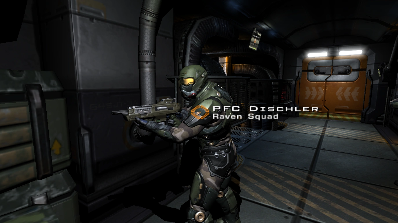 Dischler is encountered aboard the USS Hannibal after the briefing of Operation: Last Hope during the Strogg assault against the USS Hannibal. He is guarding the door to the Walker Bay with Private Shephard.