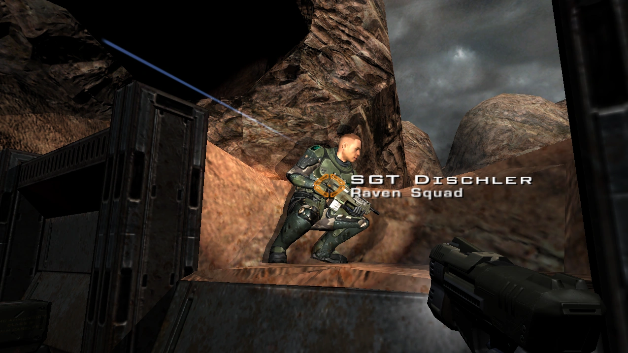 Dischler is encountered in a foxhole at the first trench section of the Air Defense Trenches. He is part of the large battle going on overhead. He pops up and down to return fire regularly, while also making comments about the battle.