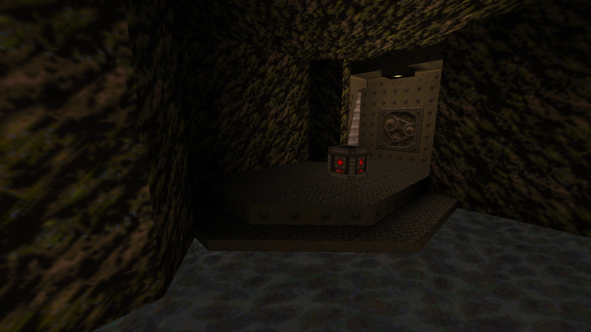 In the outdoor area with the bridge, drop off to the right of it and go through the Water into a cavern to find a 100 Health. The Door is locked until you shoot the wall near the exit Slipgate, thus you must continue swimming on until you reach an Elevator leading back to the Green Armor. |