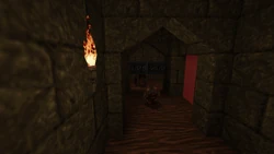 The Dismal Oubliette is the sixth and final level of The Realm of Black Magic. The level is divided into four parts, accessible from a central bridge above a pit of Water. After leaving the small starting area, players encounter a small fortress-like structure built entirely underground (shown in the screenshot). The third area of the Oubliette is a multi-story tower with several rooms on each floor and an Elevator perpetually moving between them. The final area is a slow Elevator descent into a deep shaft, leading the player towards the final confrontation against a Vore and the second Rune.