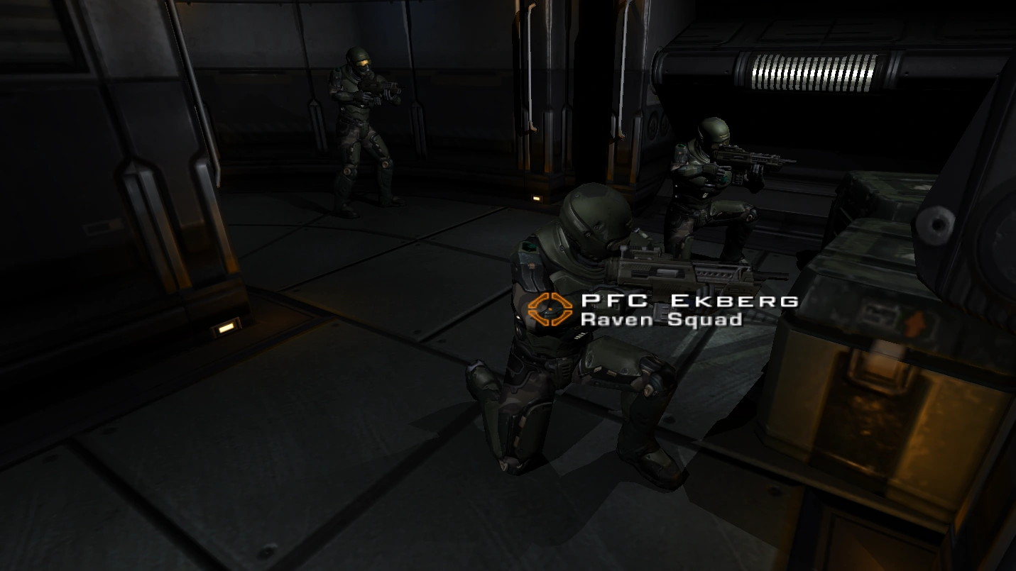 Ekberg is encountered aboard the USS Hannibal after the briefing of Operation: Last Hope during the Strogg assault against the USS Hannibal. He is guarding a door near the entrance to the corridor leading to the Drop Pod programmed to fly Corporal Kane to the Data Storage Tower. He guards the door with Sergeant Bordwell and Private First Class Whitaker.