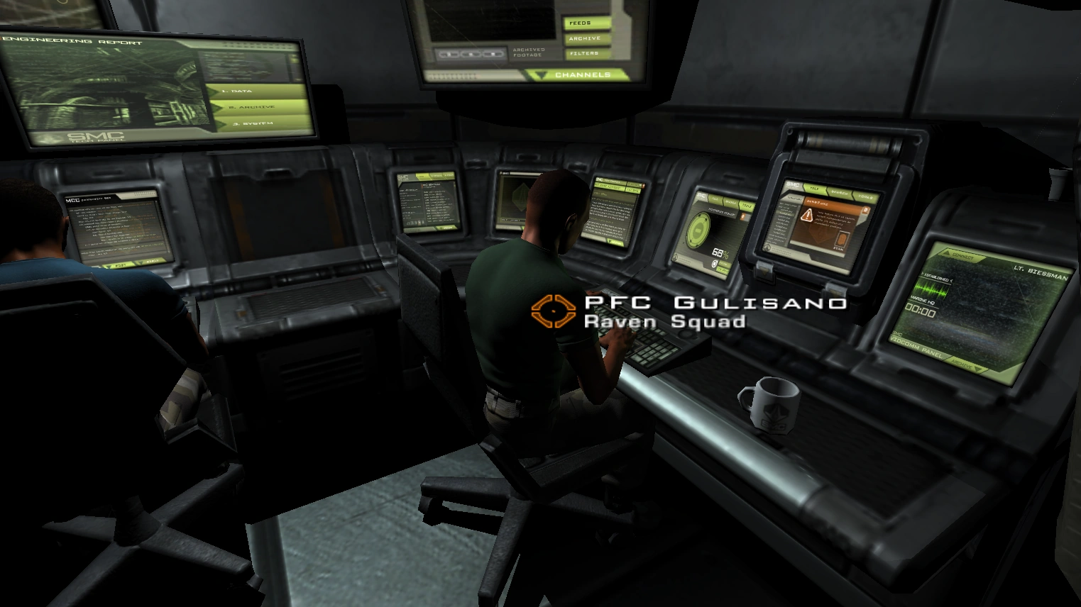 Gulisano is encountered aboard the USS Hannibal while working on a terminal. During Operation: Advantage, he is contacted by an injured Marine who claims he needs a Medic. Gulisano is unable to identify the Marine because he cannot get a reading on the Marine's medchip. The Marine claims his medchip is damaged to Gulisano's surprise, who says the medchip is implanted in the heart. The Marine then answers he knows and that he's looking at his heart while they are discussing this.