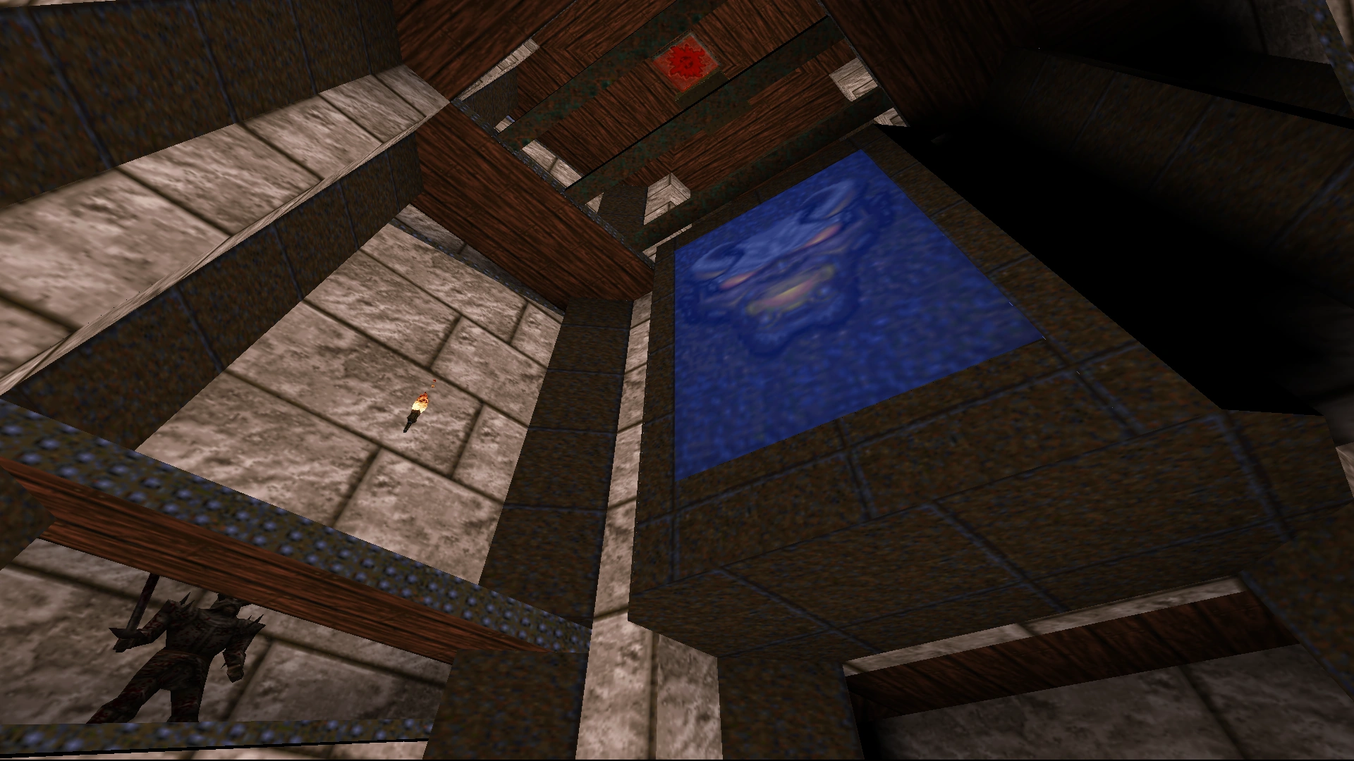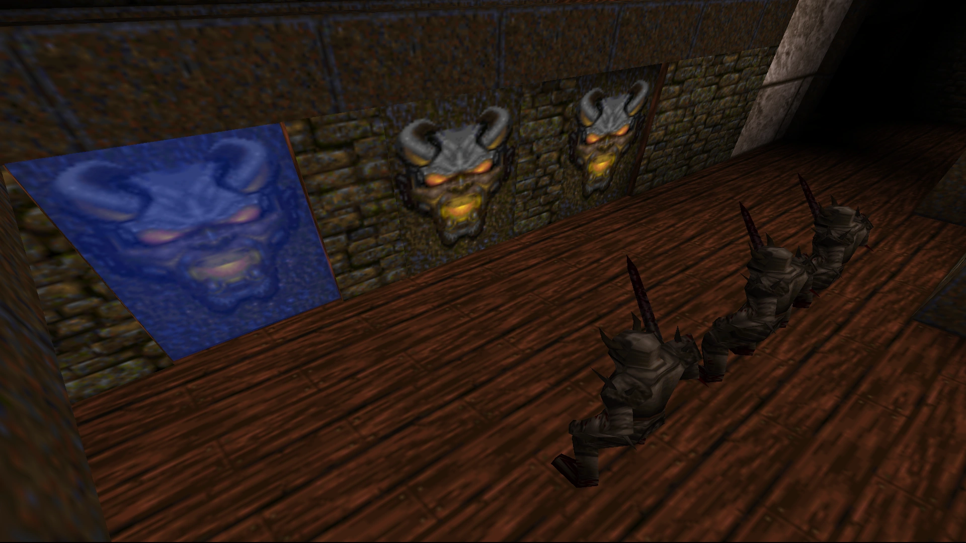 In the corridor next to the same floor as (#4), approach the leftmost of the three demon faces to open a door to a secret with a Quad Damage. |