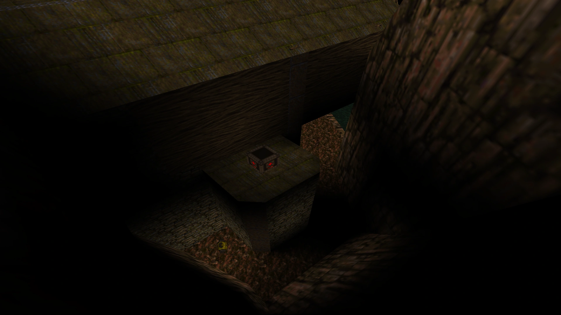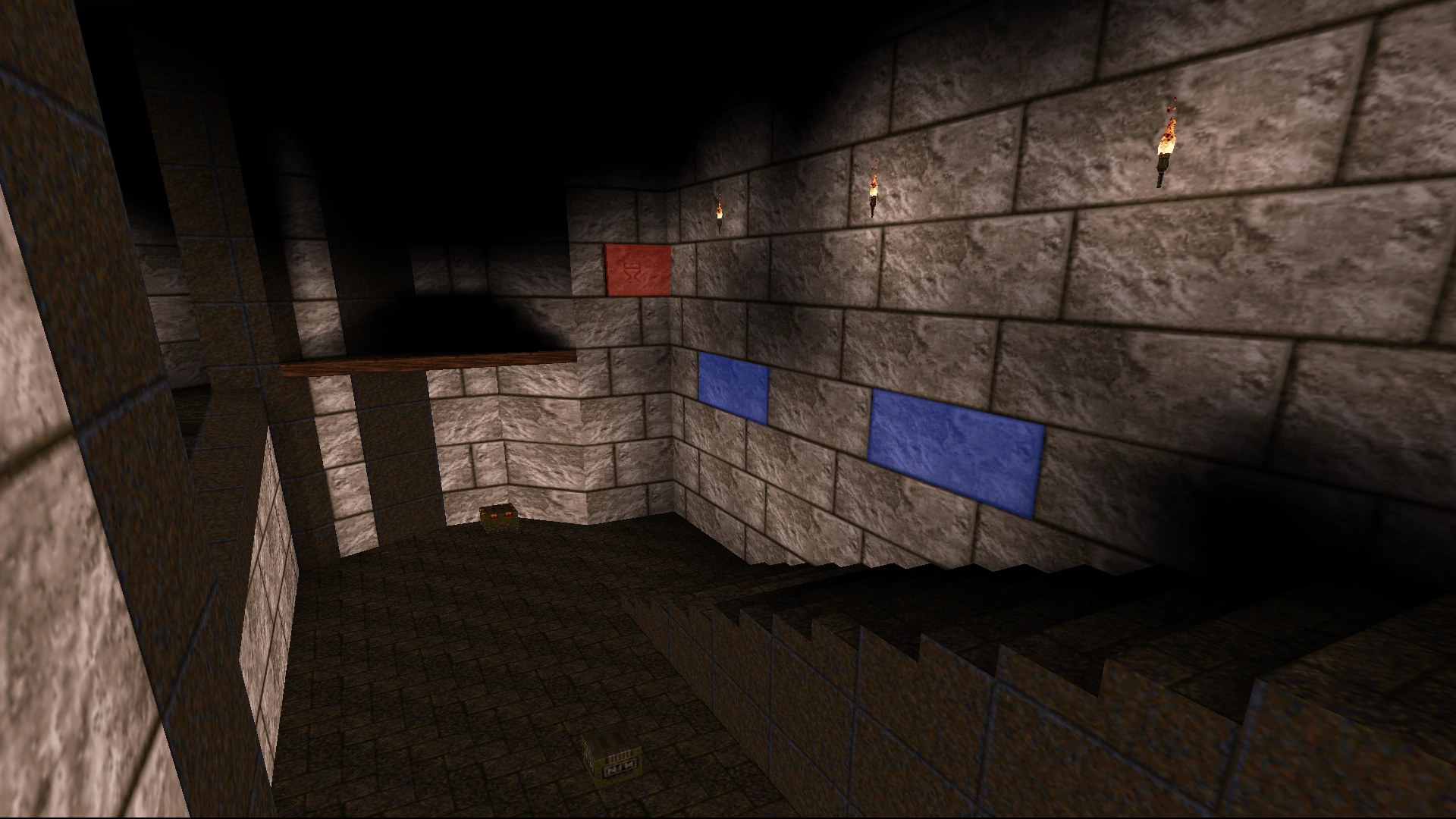 In the large stairway room, shoot the brick with a cup mark on it to make two more bricks pop out and a 100 Health appear on a nearby ledge. Jump across them to collect it. |
