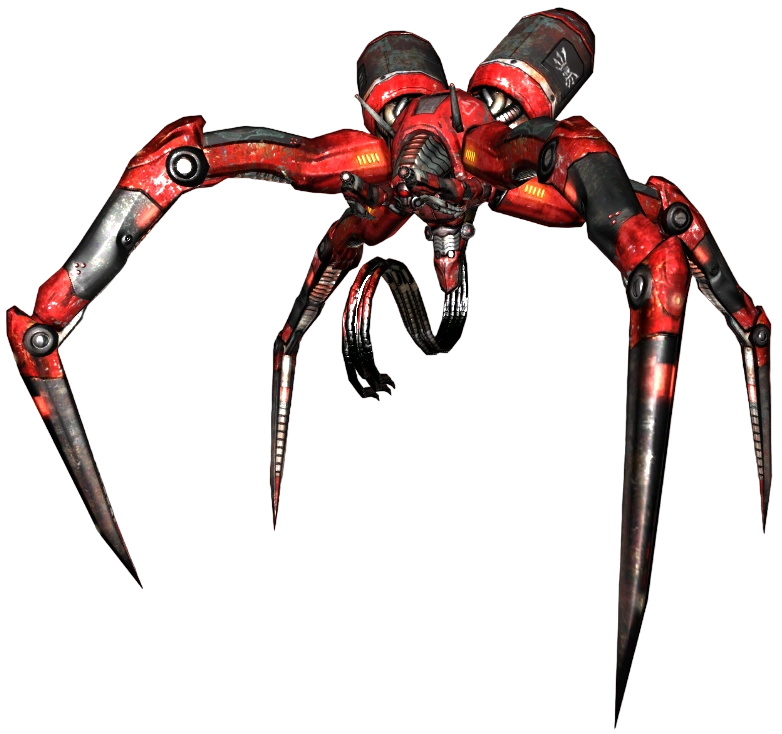 In Quake 4, Harvesters are gigantic, 50-foot tall spider-like robot mechs used by the Strogg as anti-vehicle heavy armor. They are the largest, most powerful Strogg units seen in the game. The Harvester consists of a humanoid "torso" (equipped with two blaster arms) attached to four spider-like legs. They only appear in a handful of levels, and can only be properly fought if the player is inside a vehicle (hovertank or mech walker). They are extremely resilient (5,000 health points, the most durable non-boss enemy) and very dangerous. They attack primarily with a full-auto blaster, and can periodically launch a swarm of two or three powerful homing rockets. They can also impale enemies and even vehicles with their legs; this attack is an instant kill even against a hovertank. Harvesters are seen in the first level, but it won't attack at the player. The player will meet the first hostile Harvester in level Aqueducts Annex.