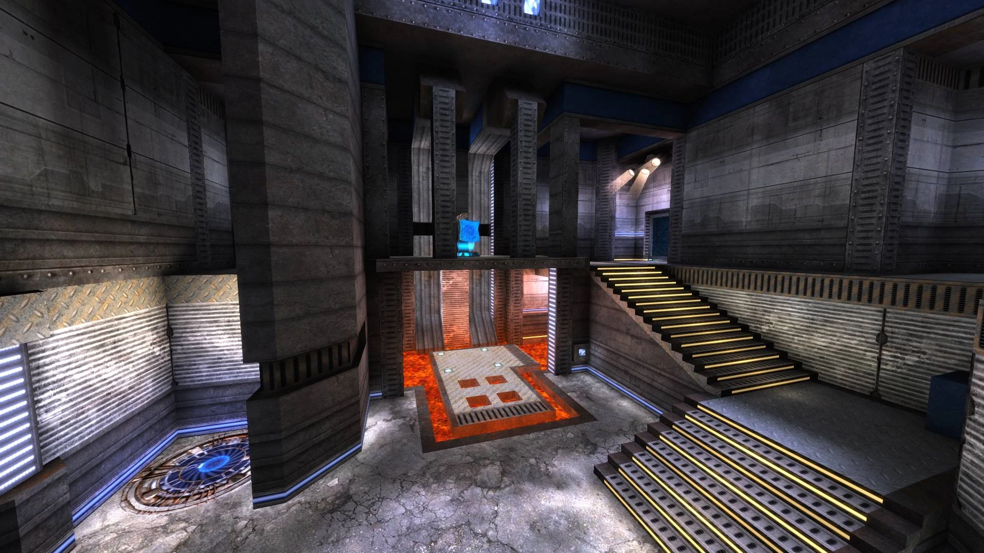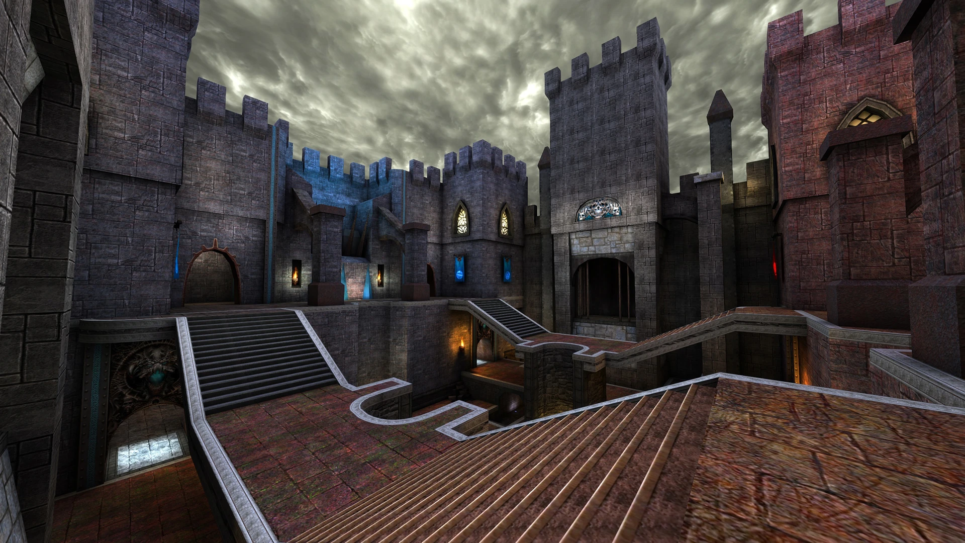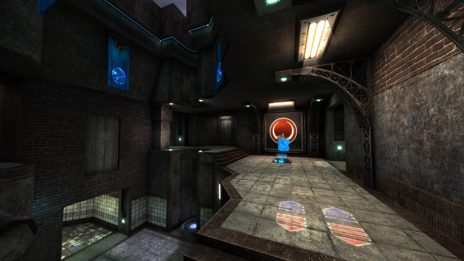 Similar to Team Arena CTF with Rune power-ups, but this time a scrapped content added back into it. Any player will now start with an additional Grappling Hook. Like in Team Arena, constant class power-ups called "Rune" will spawn in each team's base. This time they spawn after a certain time limit is hit to prevent teams awaiting their Runes to spawn for prolonged times. Namely Damage, Guard, Armor-Regen and Scout will spawn in each base. While this makes the pickup shares somewhat easier to distribute depending on roles, it doesn't make the challenges any easier. It's up to team to figure out which player plays which Rune the best they can. Arena CTF maps revolve around domination of usable items or power-ups beforehand more than the flag itself to organize an effective attack as game is much more fast paced compared to classic counter-part.