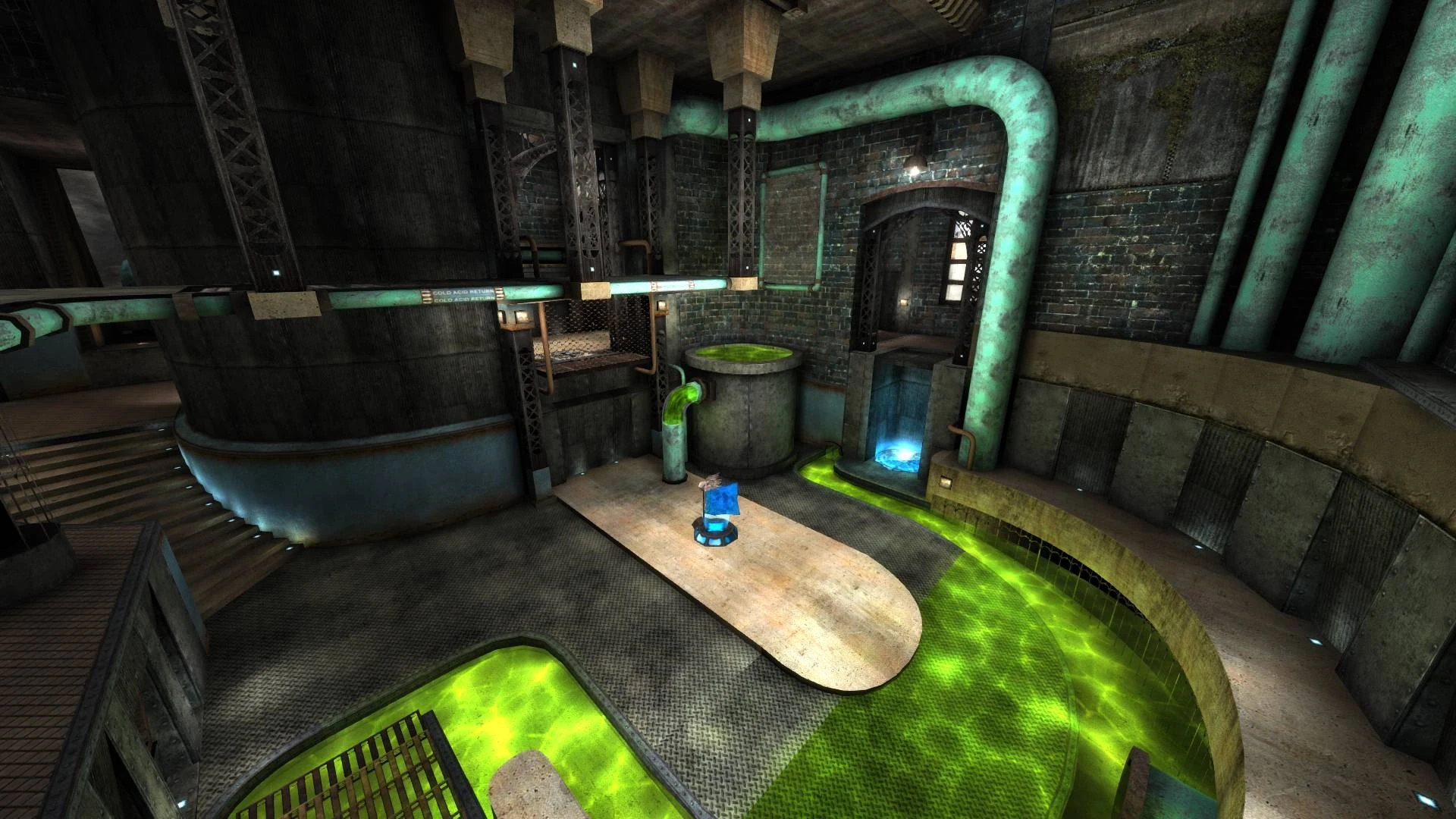 All pickups removed from the map, players share the same spawn point. Players start with unlimited Plasma Gun, Rocket Launcher and a standard Gauntlet. Checkpoints laid out along a pathway in the map, players can't be harmed by anything but can be slowed down. All players spawn at start point then follow checkpoints to light up the next until they reach the finish. Along the match, it's possible to slow the enemy down by your starter Plasma fire or Gauntlet jabs, as well as advancing in the air by Rocket splashes as you shove them behind. If players were to thrown away off-track, they can respawn at last check point by a self-kill command.