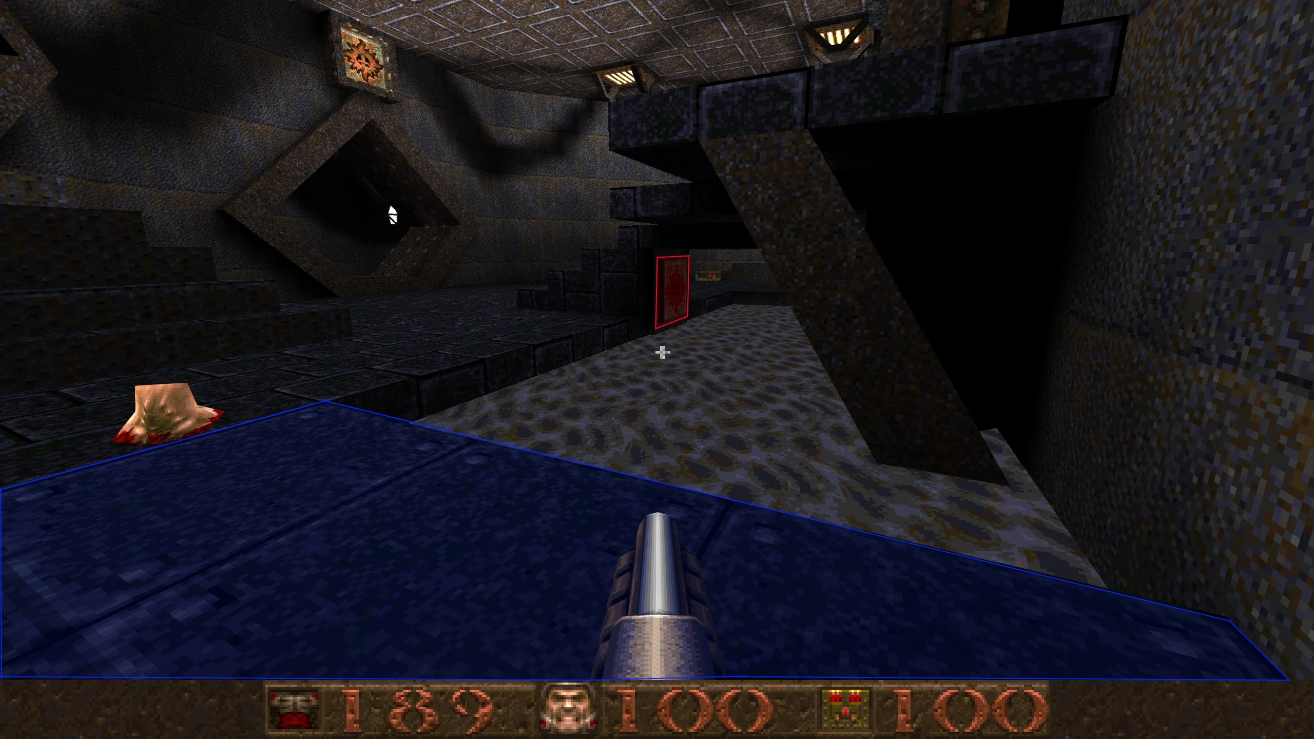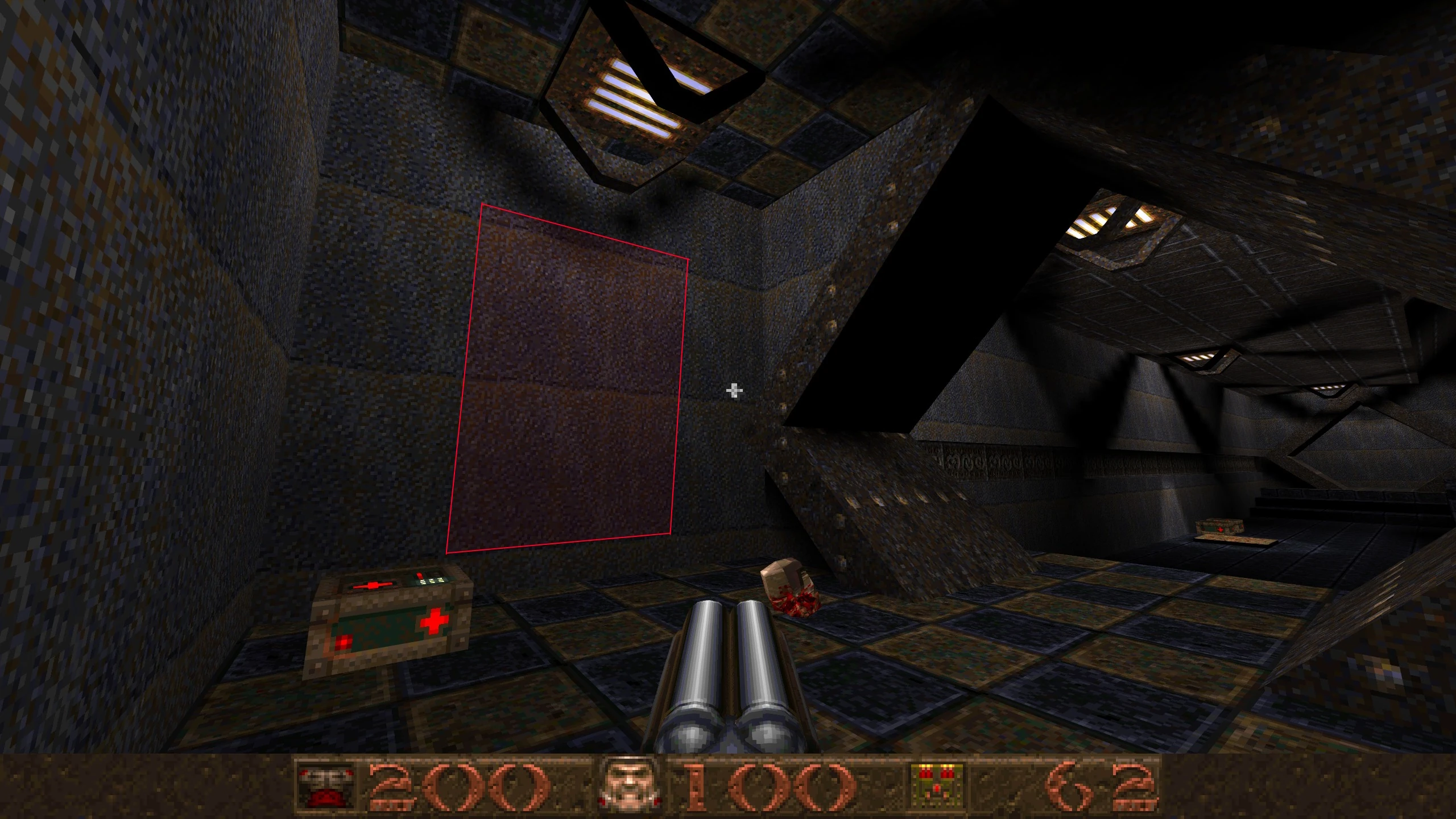 In the big room with the Grenade Launcher, on the left, there is an inaccessible cage over the lava with a 100 Health. Shoot the twitching light in the hallway at the other end of the room to open a Teleporter leading to the platform. |