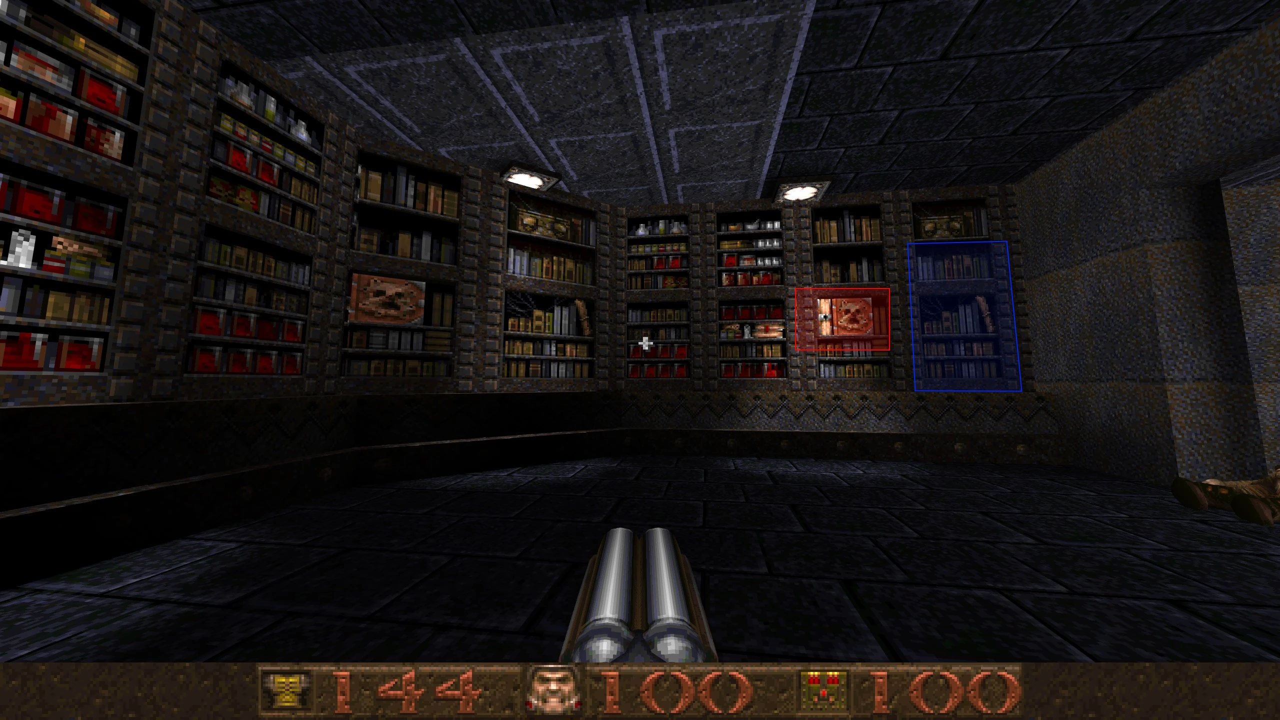 After opening the Gold Door and activating the lightning machine, you reach a library displaying some books with an eerie looking face on them. Press the one closer to the lift to reveal a Quad Damage. |