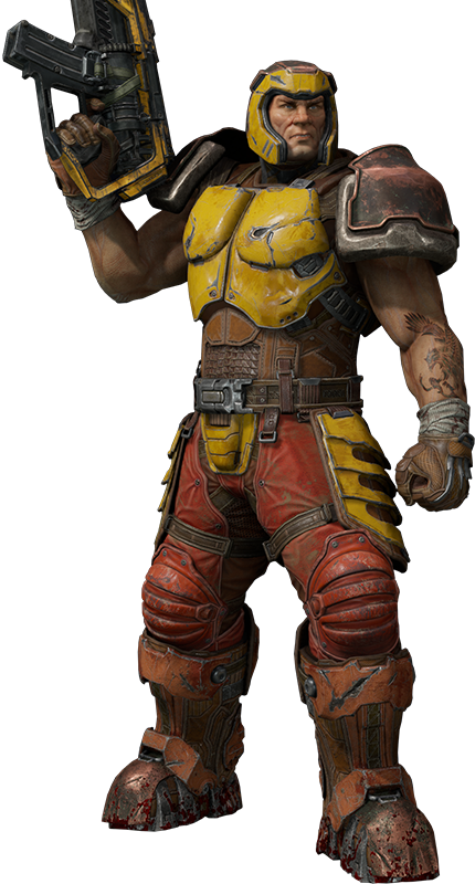 Two decades ago, a lone Marine stepped through the Slipgate and into nightmare. He cut through countless horrors to find four eldritch Runes, then laid waste to the abomination known as Shub-Niggurath. Trapped in these realms ever since, he has survived using the power of the Dire Orb seized from within the hot gore of the All-Mother. Time and delirium have eroded his resolve and even his name, but a worn family photograph tucked away in his armor serves as a scrap of hope and sanity.