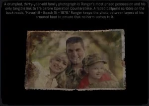 A crumpled, thirty-year-old family photograph is Ranger’s most prized possession and his only tangible link to life before Operation Counterstrike. A faded ballpoint scribble on the back reads, “Haverhill – Beach St – 1978.” Ranger keeps the photo between layers of his armored boot to ensure that no harm comes to it.