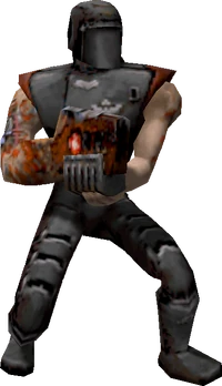 Like the three Guards in the original Quake II, there is a chance the Ripper Guard will perform a final attack when it is killed but not gibbed. It falls onto its back, raises its weapon and fires two more shots directly forward before succumbing to death.