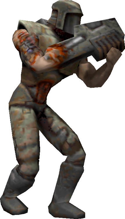 In Quake II, Shotgun Guards are one of the three Stroggified humans who wear pale green armor. As the name suggests, Shotgun Guards are equipped with a Shotgun and they are a significant step up from the Light Guard - a little more health, but more importantly, a weapon that can actually do some damage to you if you're not careful.