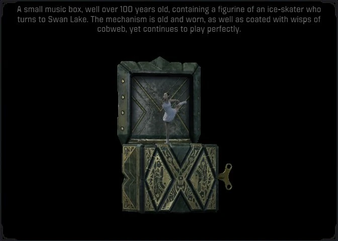 A small music box, well over 100 years old, containing a figurine of an ice-skater who turns to Swan Lake. The mechanism is old and worn, as well as coated with wisps of cobweb, yet continues to play perfectly.