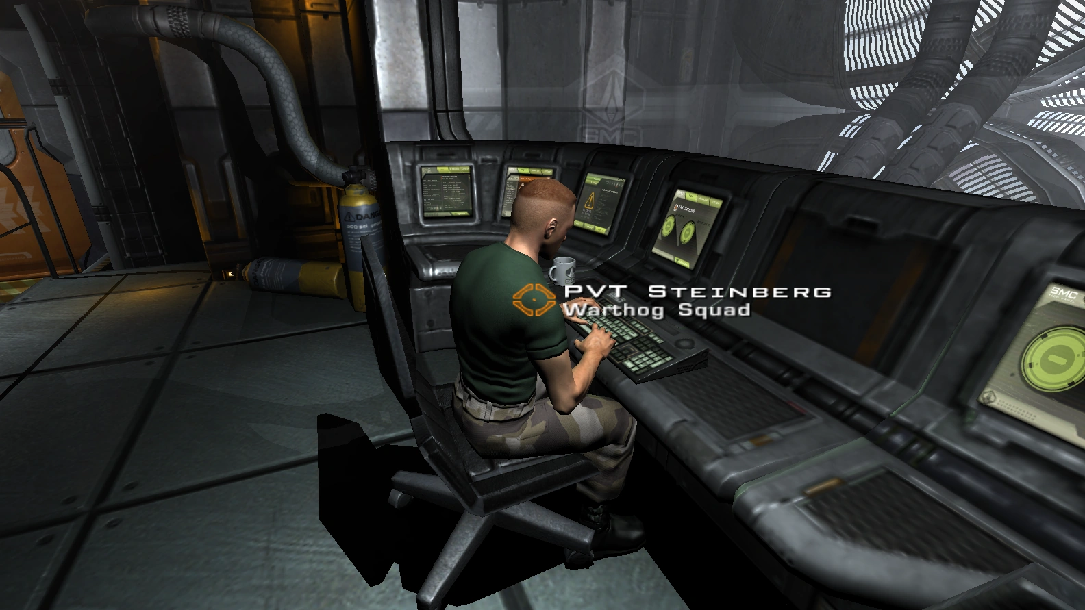 Steinberg is encountered aboard the USS Hannibal while working on a terminal. He is communicating with someone who reports percentages on a device they are working on.