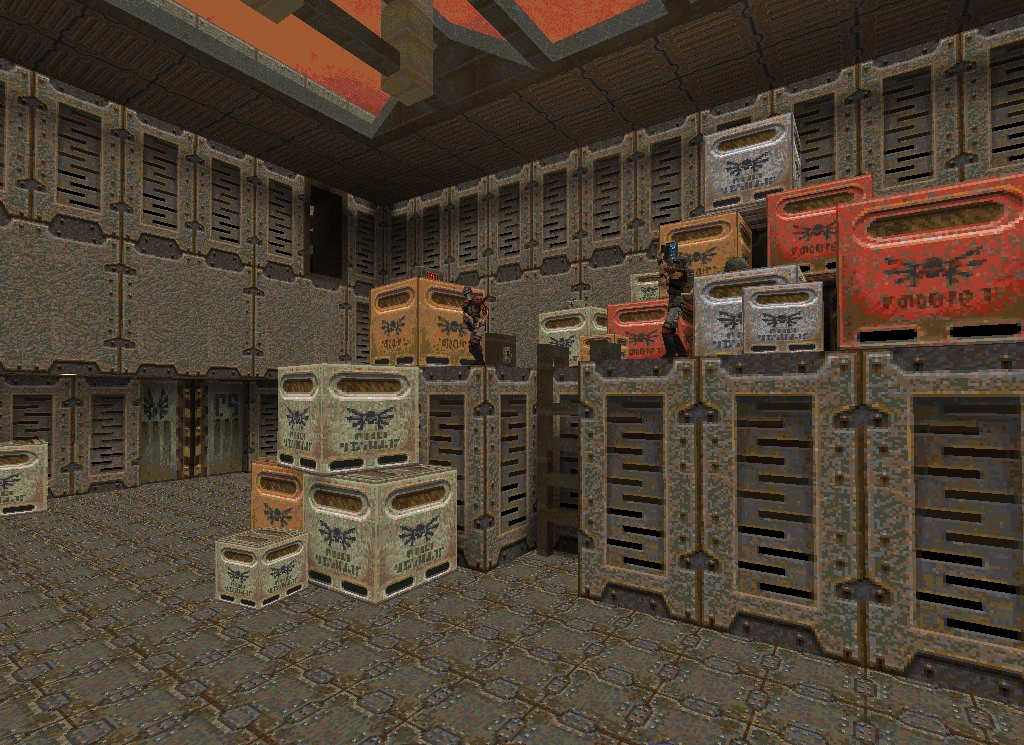 - #3) Eventually, you will crawl your way through a vent shaft, into a two-level room with a "crate maze"; when you get to the crate maze, immediately take a left and then look to your left at the intersection, where the Enforcer is; the bottom-right crate has a slightly different color to it; shoot it to lower it, revealing a Megahealth.