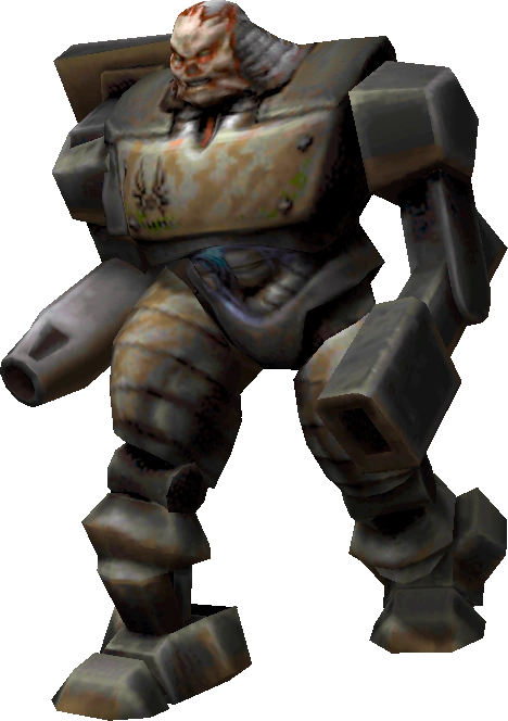 In Quake II, the Tank is a large bipedal Strogg battle walker. It is slow and cumbersome, but wields an arsenal of powerful weaponry - its left arm sports a powerful blaster, its right arm sports a machine gun and it has a rapid-firing rocket launcher mounted on its shoulder.