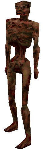 In Quake, a Zombie is an undead human that tears chunks of flesh from its head, hindquarters, and crotch before proceeding to toss them at the player character for minor damage. The chunks disappear instantly if they collide with an opponent, but stick to walls and other surfaces for a second. The chunks are thrown in an arc, meaning that their opponents can evade these projectiles as long as they remain outside of the throwing range.